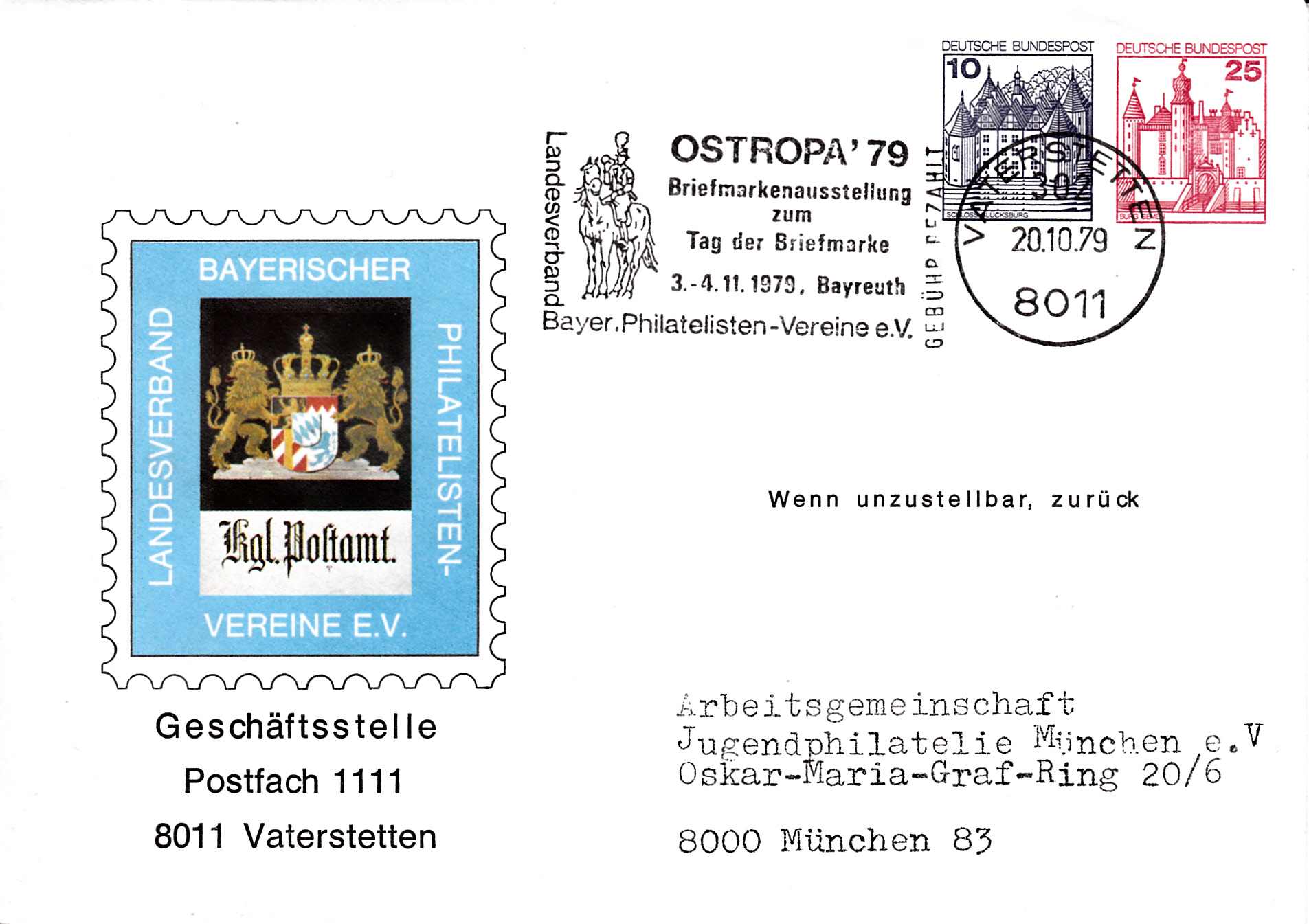 Dieser Ganzsachenumschlag mit einem Wertstempel zu 25Pf und einem zu 10Pf aus der Serie "Burgen und Schlösser" (MiNr 996 und MiNr 913) wurde am 20.10.1979 mit einem Absenderentwerter des Landesverbandes Bayerischer Philatelisten-Vereine entwertet.