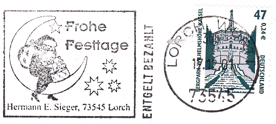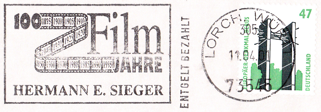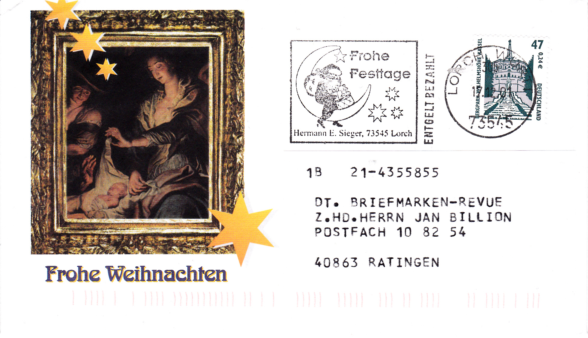 Hier eine Infopost-Sendung der Firma Sieger mit einer Marke zu 47Pf aus der Serie "Sehenswürdigkeiten" (MiNr 1932) frankiert und einem Absenderentwerter entwertet.
