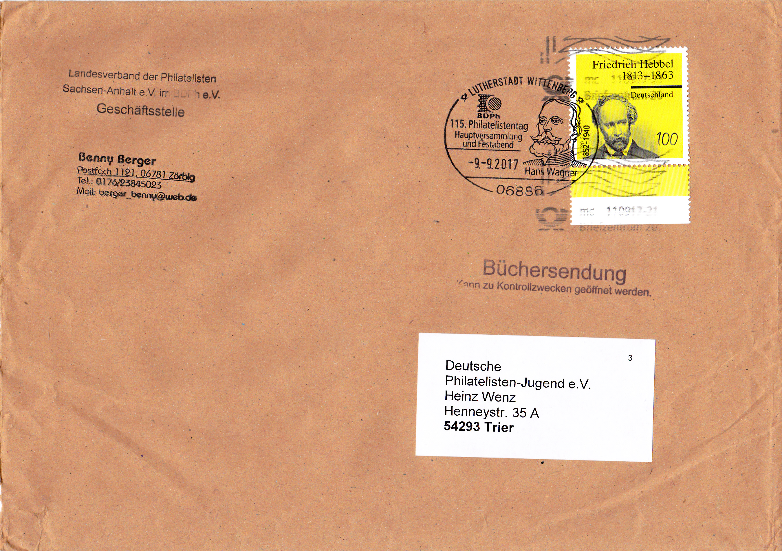 Diese Büchersendung groß wurde am 9.9.2017 bei der Sonderpostfiliale in Wittenberg aufgegeben und mit einem Sonderstempel zum 115. Philatelistentag gestempelt. Am 11.9.2017 wurde die Sendung im Briefzentrum 230 durch eine weitere "Entwertung" verunstaltet.