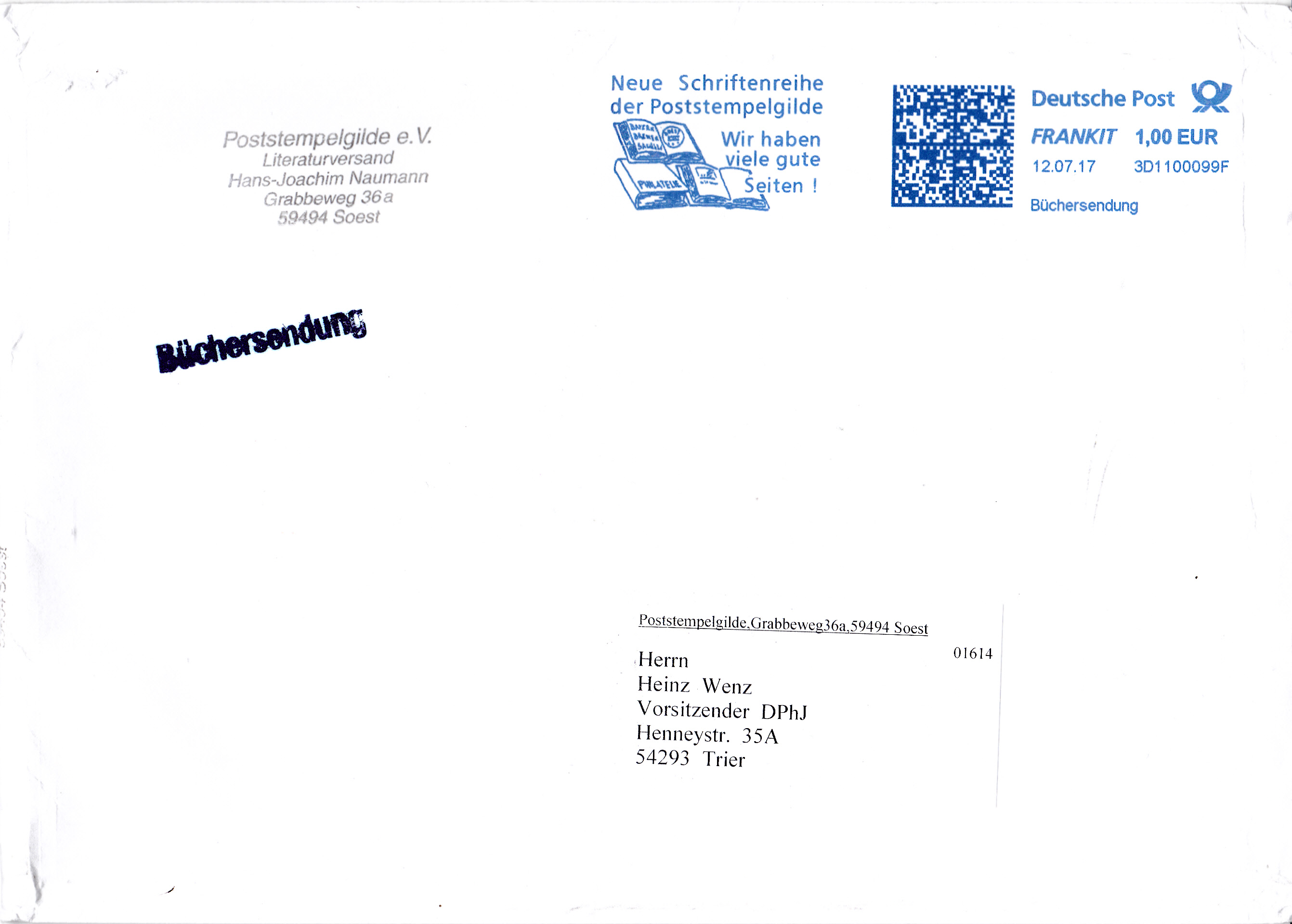Diese Büchersendung groß wurde am 12.07.2017 mit einem FRANKIT-Frankierstempel freigemacht. Der Identcode "3D1100099F" im Klartextbereich neben dem aufgedruckten Datum enthält Informationen über Hersteller, Typ und Seriennummer der Frankiermaschine. Der Hersteller ist mit "3D" bestimmbar: Francotyp-Postalia. Das Modell des Maschinenherstellers wird mit "11" angeben und die letzten 6 Zeichen geben die individuelle Maschinennummer in Hexadezimalschreibweise an: "00099F" ist als Dezimalzahl die Seriennummer 2463.