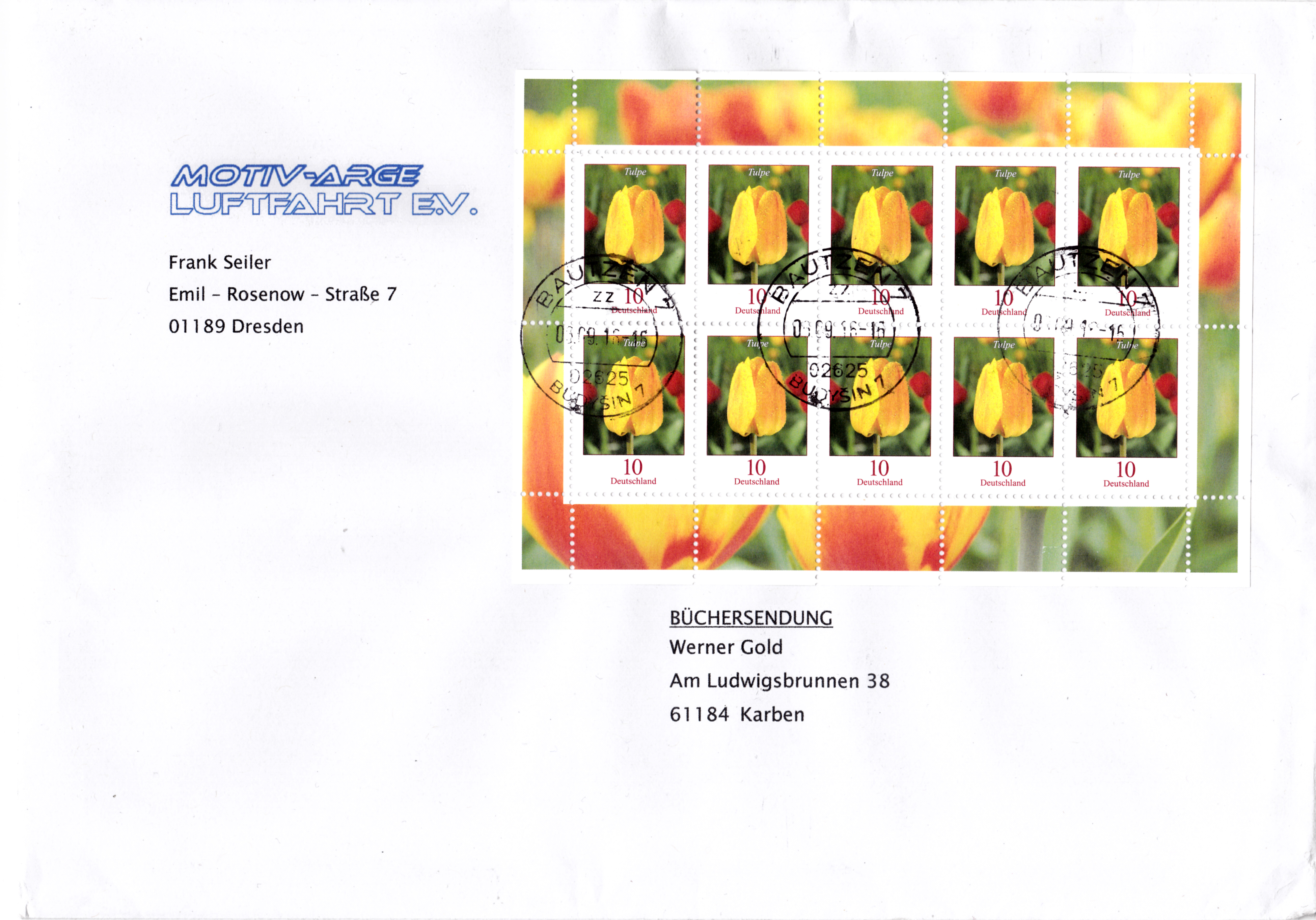 Büchersendung vom 6.9.2016 von Bautzen nach Karben wurde mit einem Zehnerbogen der Marke zu 10 Cent mit dem Motiv "Tulpe" (MiNr 2484) aus der Dauerserie Blumen frankiert. Zu beachten ist auch der zweisprachige Stempel der Postagentur Bautzen 7.