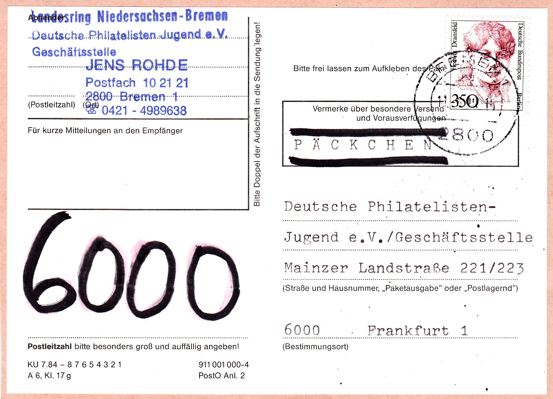 Hier ein Adressaufkleber für ein Päckchen von Bremen nach Frankfurt aus diesem Zeitraum (genaues Datum nicht eindeutig lesbar) mit EF einer Marke zu 350Pf aus der Dauerserie "Frauen" (MiNr 1393).