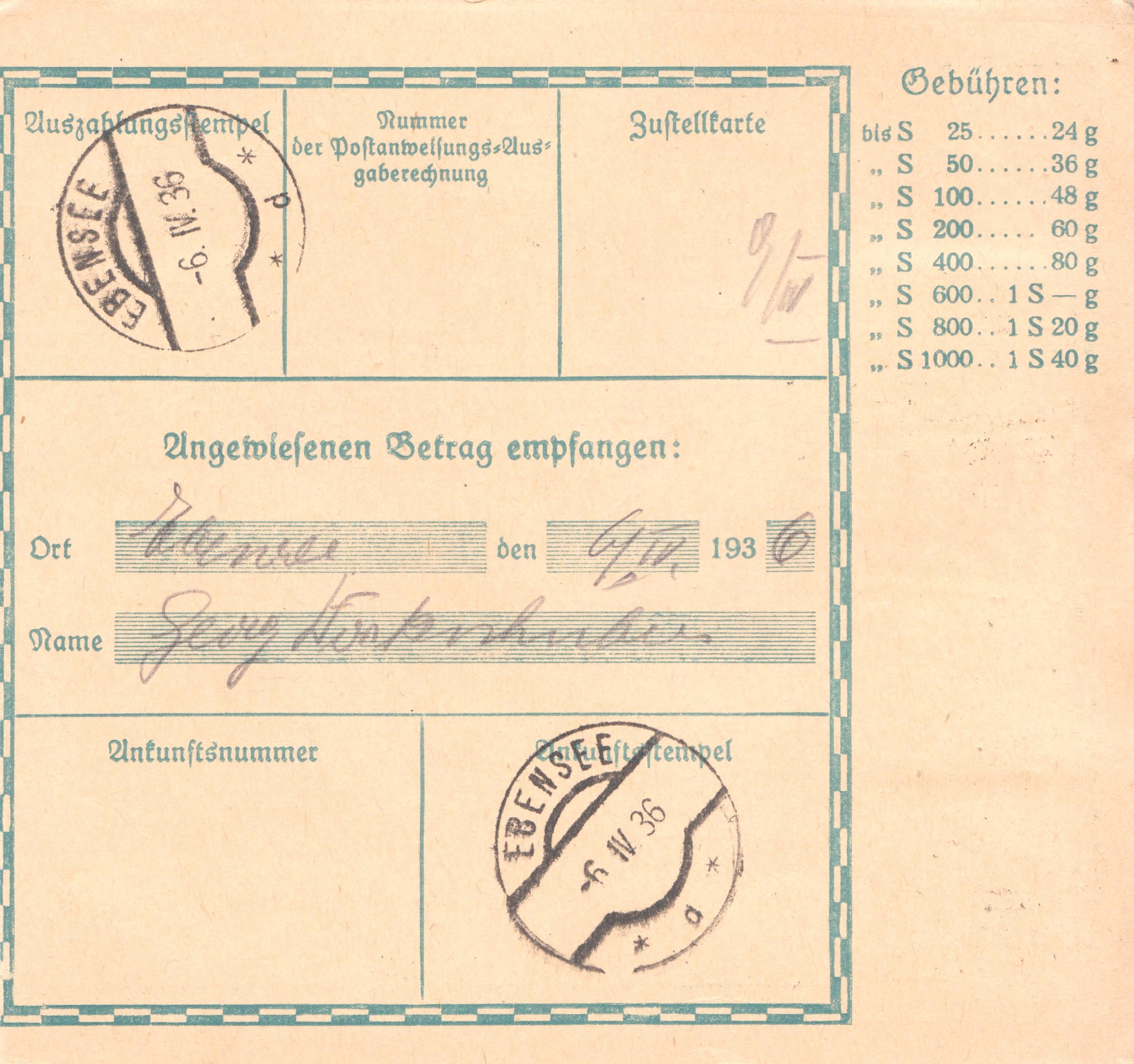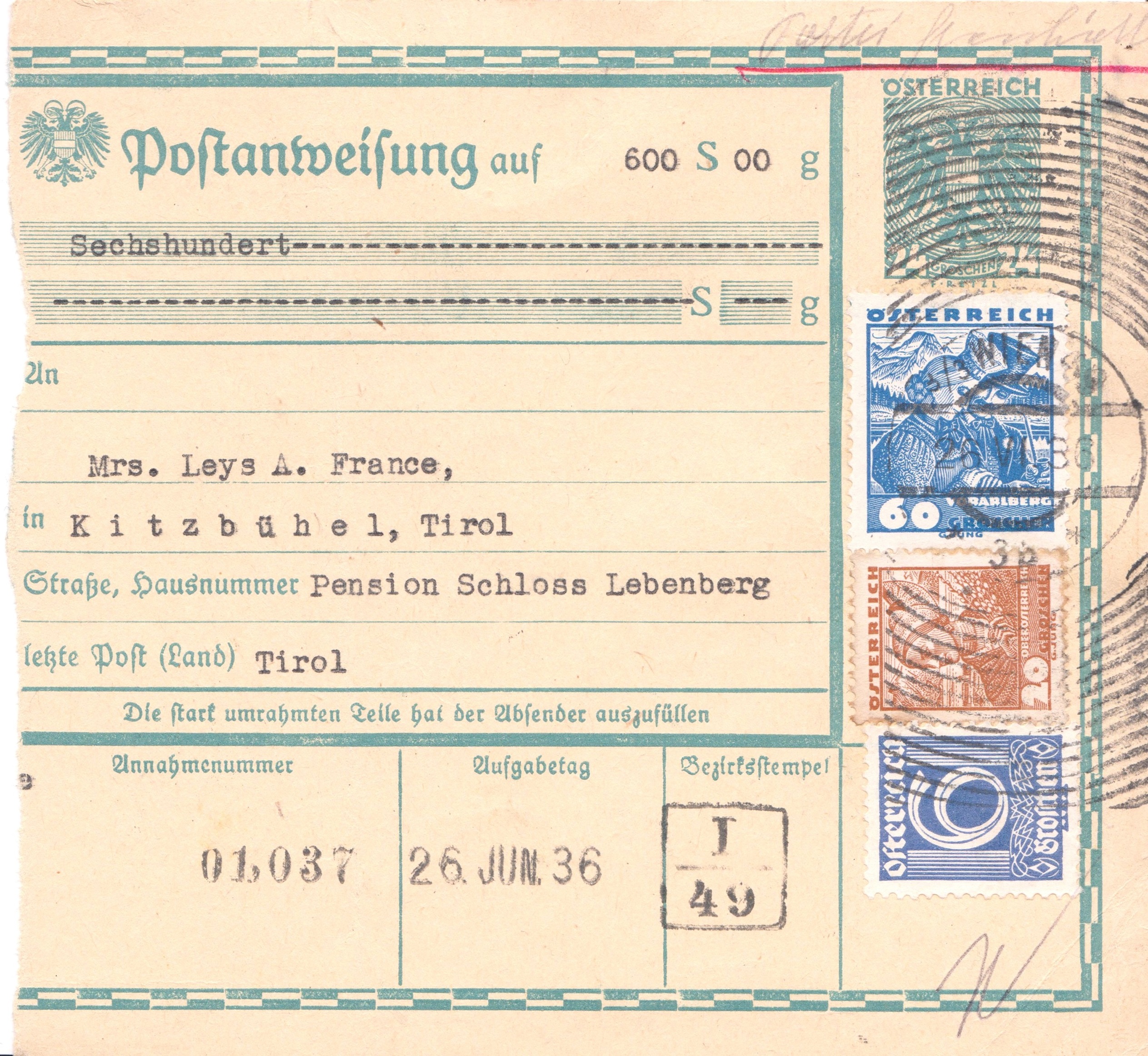 Postanweisung aus Österreich vom 26.06.1936: