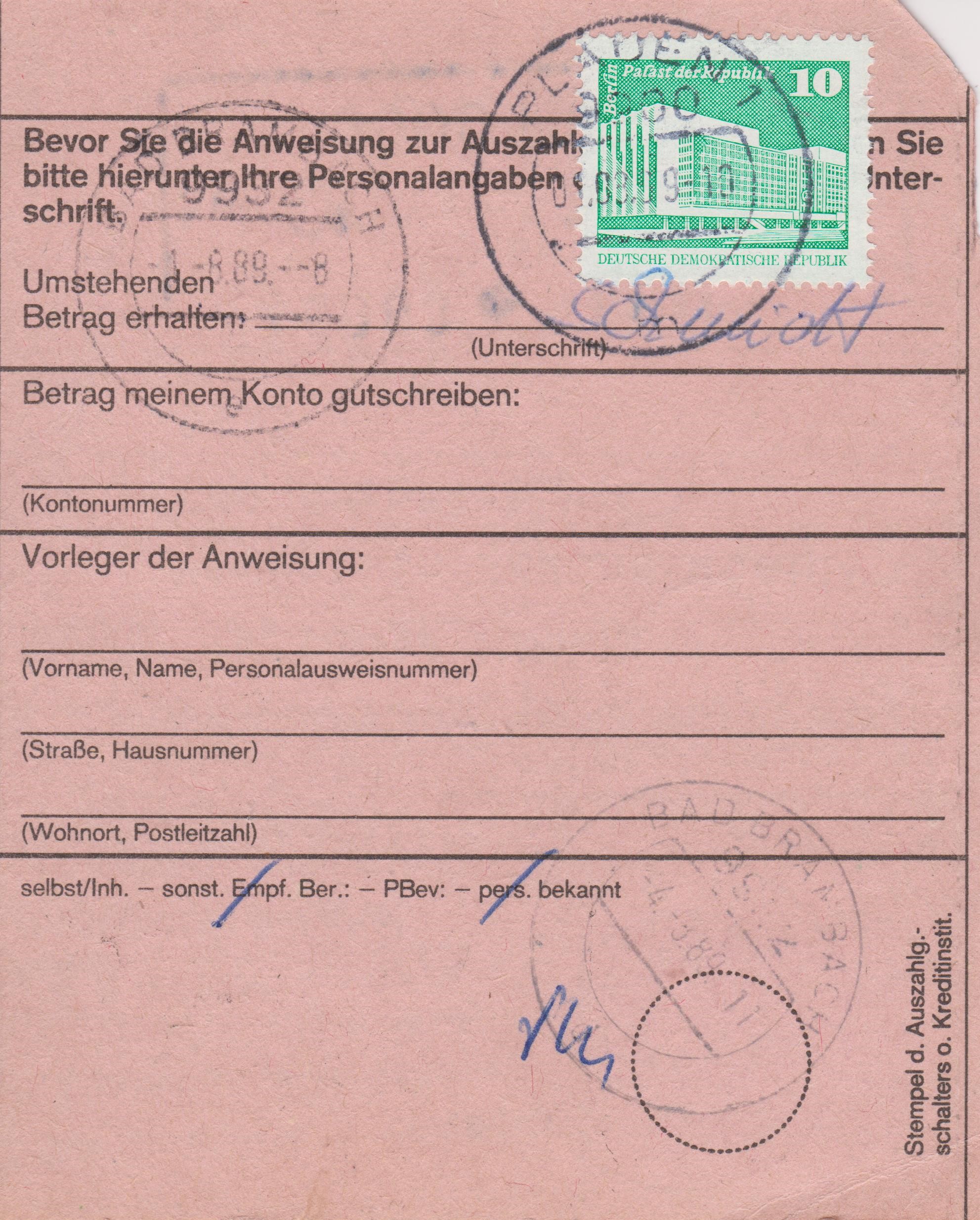 Diese Postanweisung von 15 Mark, adressiert nach 9932 Bad Brambach, wurde am 01.08.1989 in 9900 PLAUEN 1 aufgegeben: