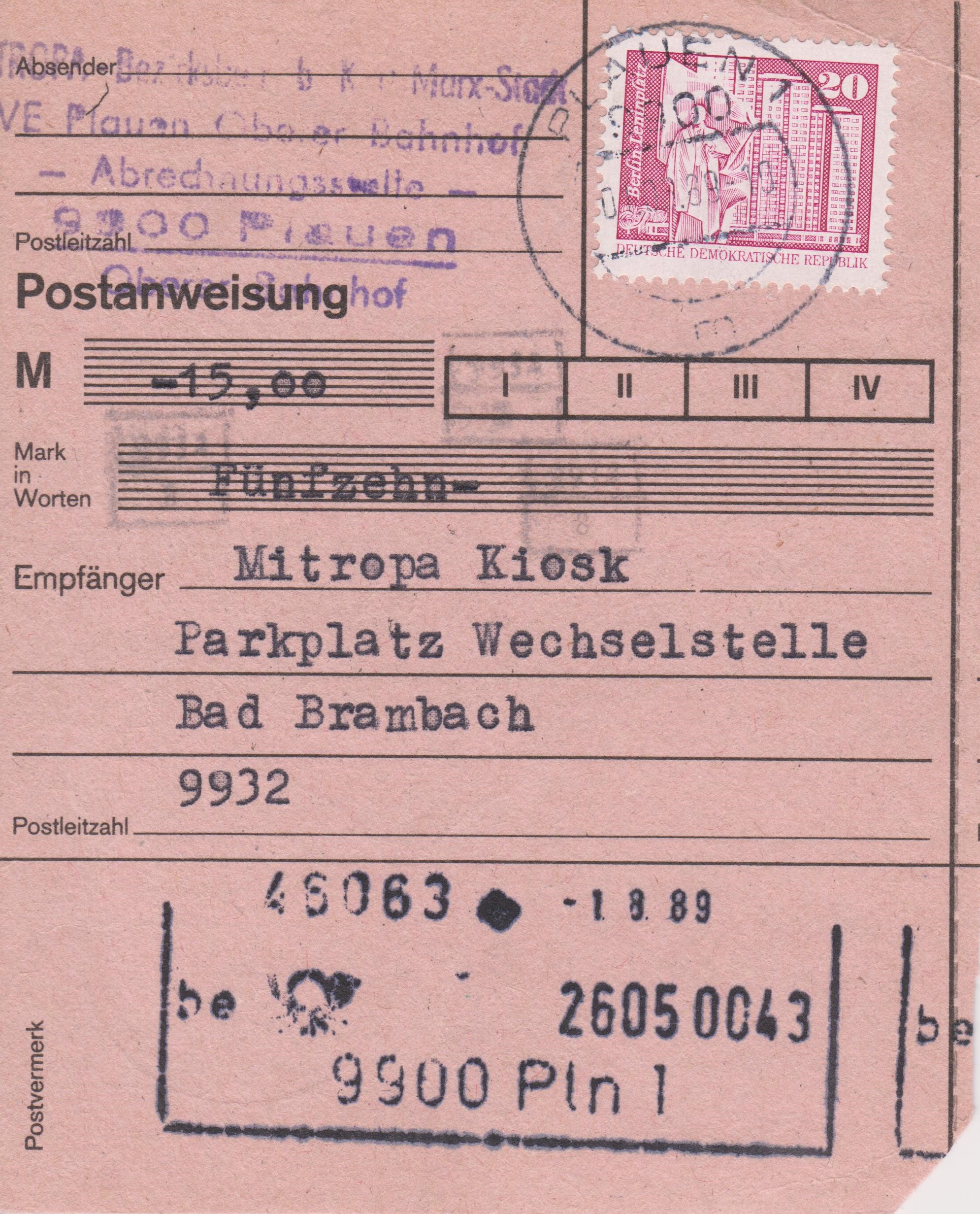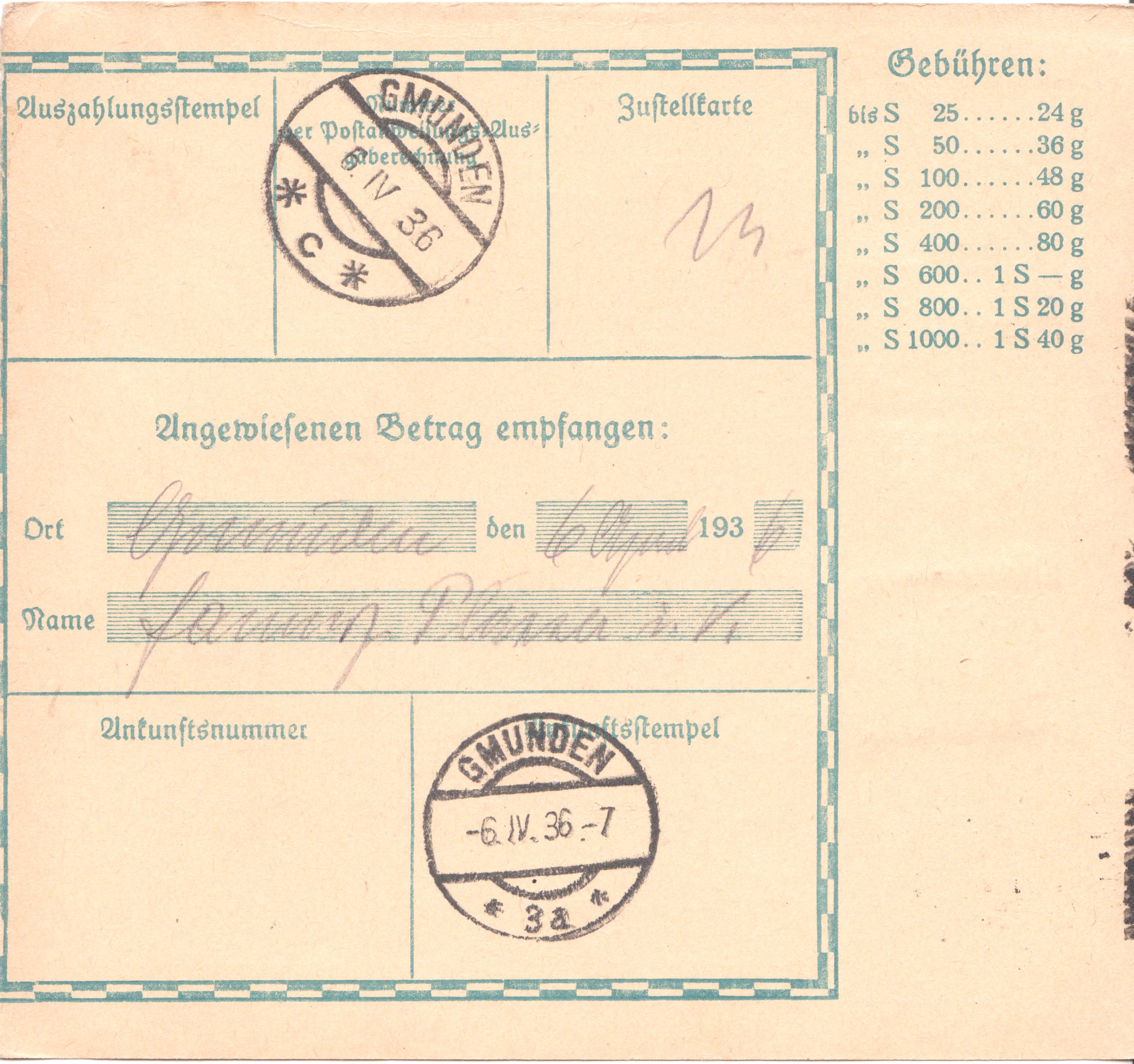 Der auffällige Stempelabschlag stammt von einer Handstempelmaschine zur Bearbeitung von Postanweisungen, wie sie in Österreich und den K.u.k.-Nachfolgestaaten ab Ende 1902 verwendet wurden.