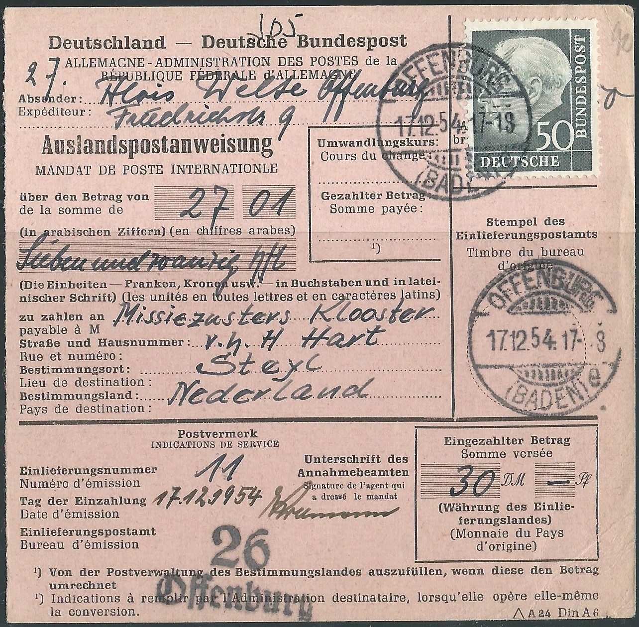 da hier im Thema Postanweisungen noch nichts gezeigt wurde, mache ich einmal den Anfang. Mir liegt eine Auslandspostanweisung vor, welche mit einer 50 Pf Heuss I Marke frankiert wurde. Es sollten 27,01 DM von Offenburg in die Niederlande befördert werden. Abgestempelt wurde der Beleg am 17.12.54. Warum komme nun ausgerechnet ich als „nicht-Belege-Sammler“ mit solch einem Stück um die Ecke? Ganz einfach, mir ging es beim Erwerb nicht um das Poststück selber, sondern um den „Kreisgitterstempel“. Und bei diesem Stempeltyp wird alles verhaftet, was nicht bei 3 auf den Bäumen ist! Egal, ob lose Marke, Briefausschnitt oder Beleg, alles kommt ins Album.