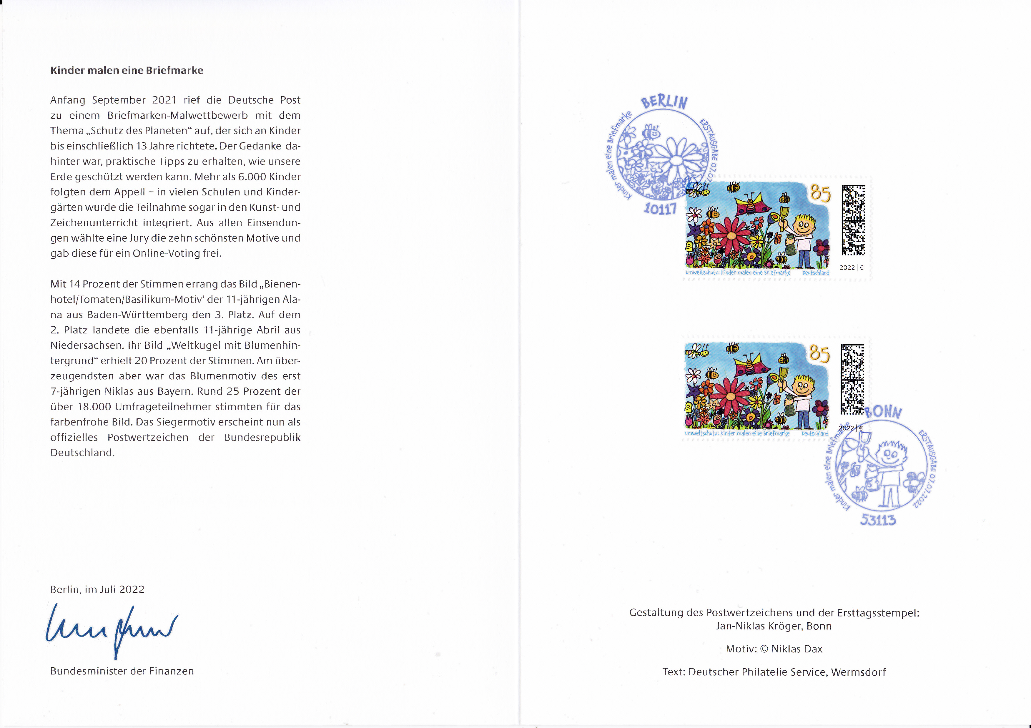 Ministerkarte des Bundesministers für Finanzen mit zwei Marken zum zum Thema "Umweltschutz: Kinder malen eine Briefmarke" (MiNr 3701) und den beiden Ersttagsonderstempel Bonn und Berlin.