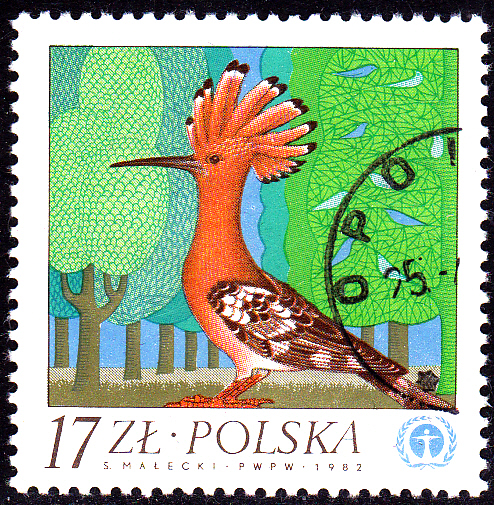 Aus der gleichen Serie kommt auch diese Marke (MiNr 2852) mit einem Wiedehopf und Bäumen.