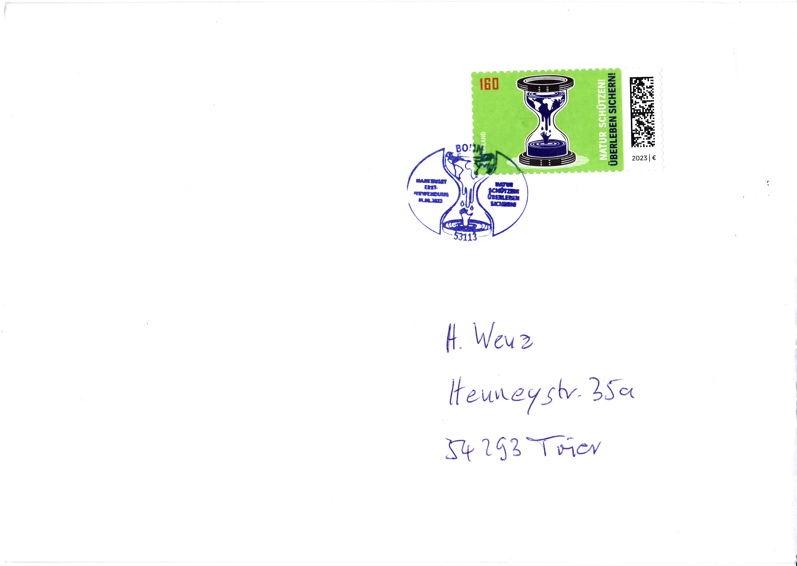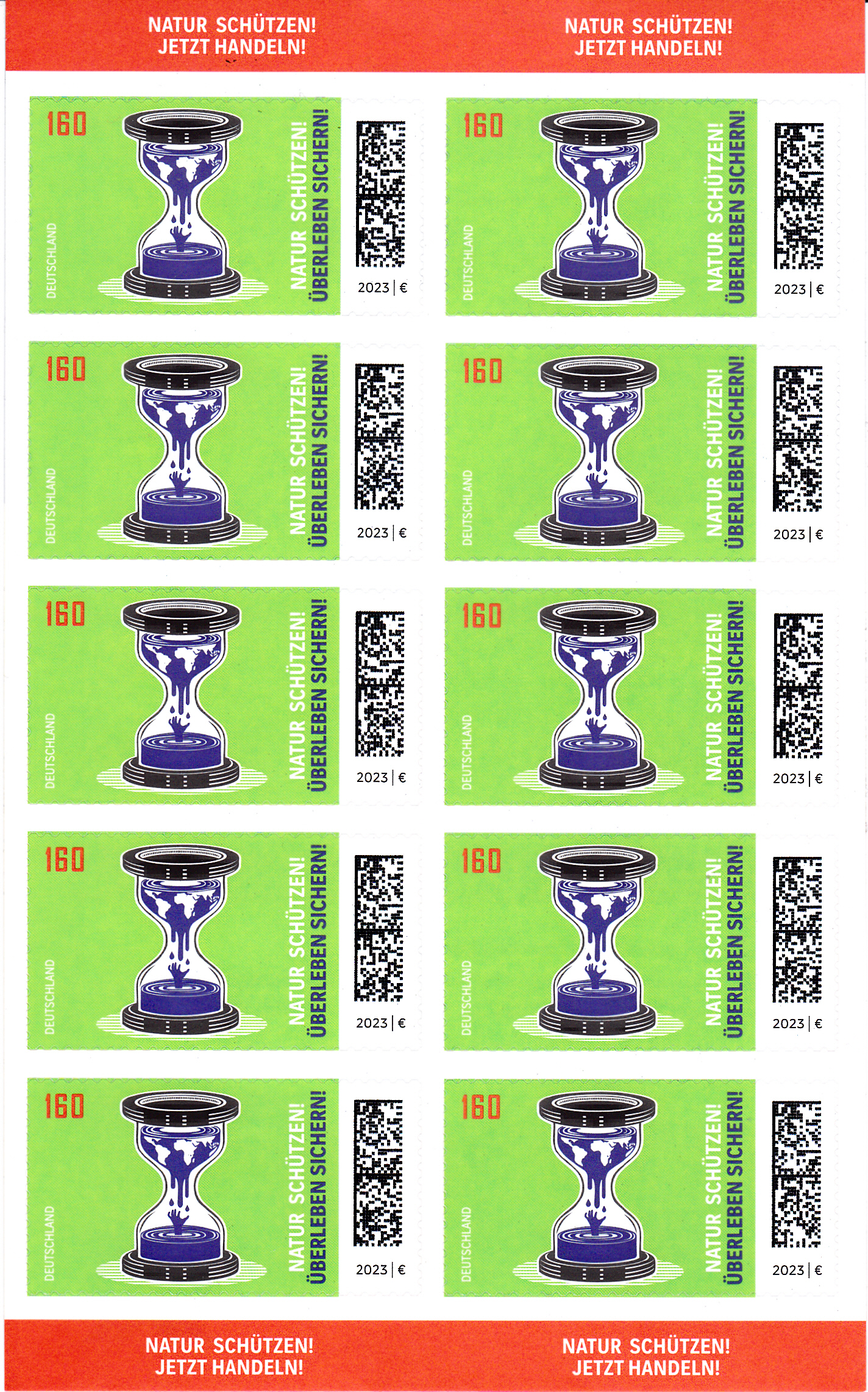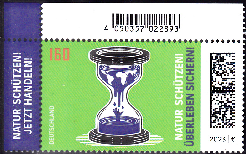 Zum Thema "Umweltschutz: Überleben sichern" erschien bei der Deutschen Post diese Marke (MiNr 3771) mit der Abbildung einer Sanduhr mit schmelzender Welt und der Hand eines Ertrinkenden. Hier zeige ich eine Marke vom Eckrand mit EAN-Codierung.