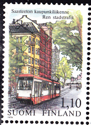 Aus Finnland kommt diese Marke (MiNr 840) zum Thema Umweltschutz: Abgasfreier Stadtverkehr. Sie zeigt eine Straßenbahn in Helsinki.