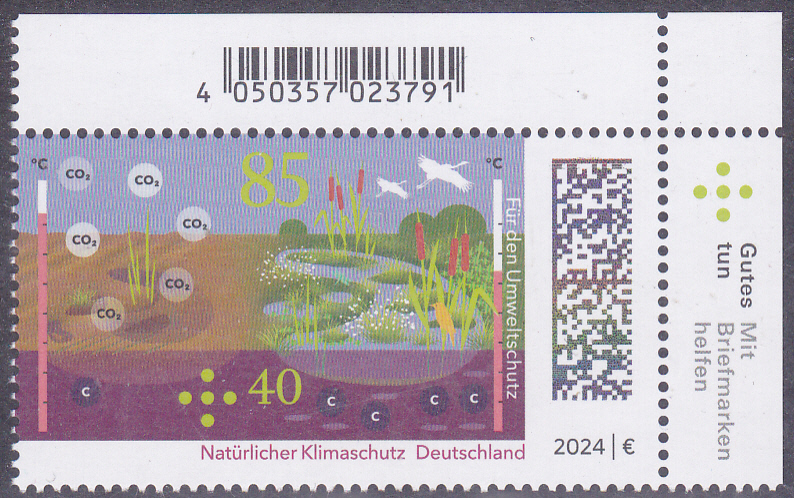 Die Marke 2024 der Deutschen Post steht (MiNr 3850) unter dem Motto "Natürlicher Klimaschutz" und zeigt ein trockengelegtes und intaktes Moor. Ich zeige hier ein Eckrandstück mit EAN-Codierung.