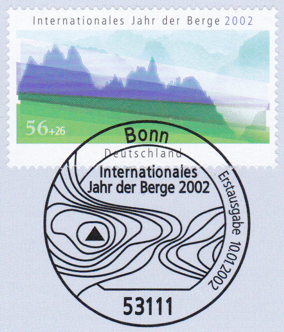 Im Jahr 2002 erschien die Marke zum Umweltschutz mit dem Thema "Internationales Jahr der Berge". Hier eine Marke mit dem Ersttagsonderstempel Bonn.