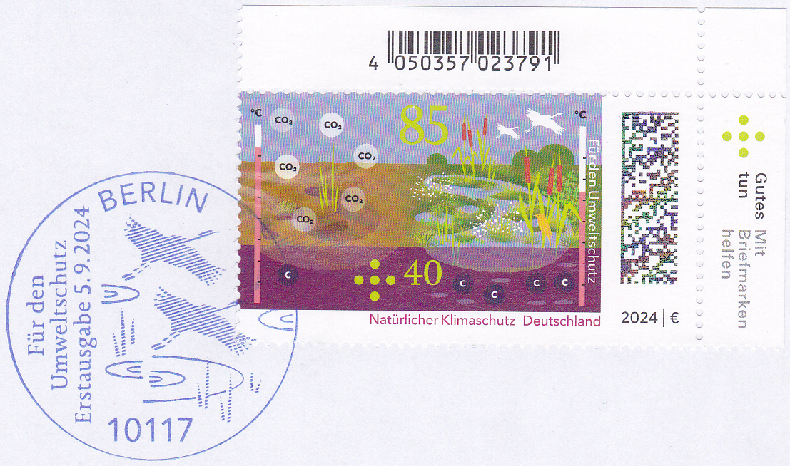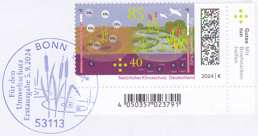 Klappkarte des Vorstandsvorsitzenden der Deutschen Post AG mit einer Marke (MiNr 3850) zum Thema "Umweltschutz - Natürlicher Klimaschutz" mit der Abbildung "Trockengelegtes und intaktes Moor" und dem Ersttagsonderstempel Bonn.