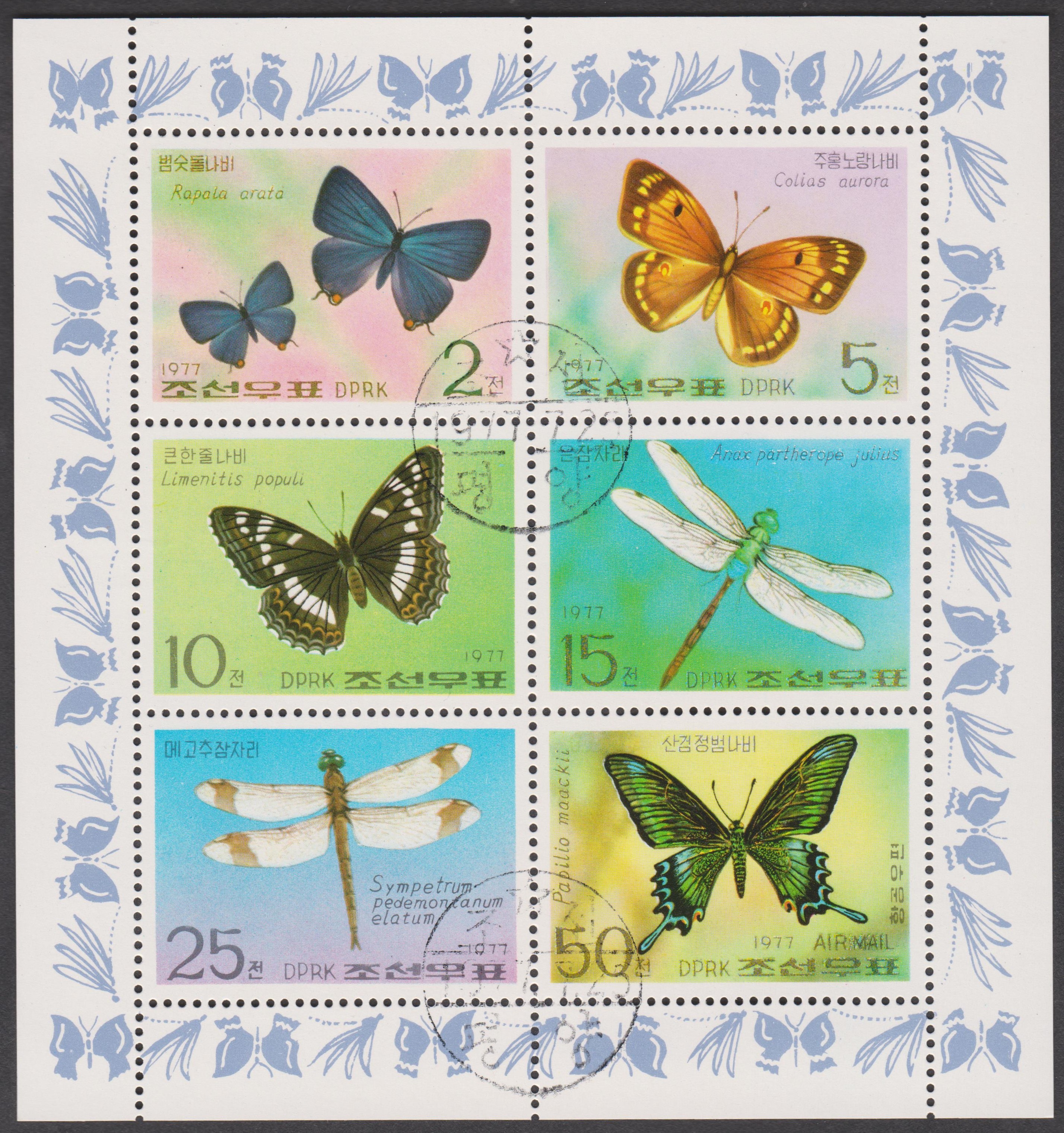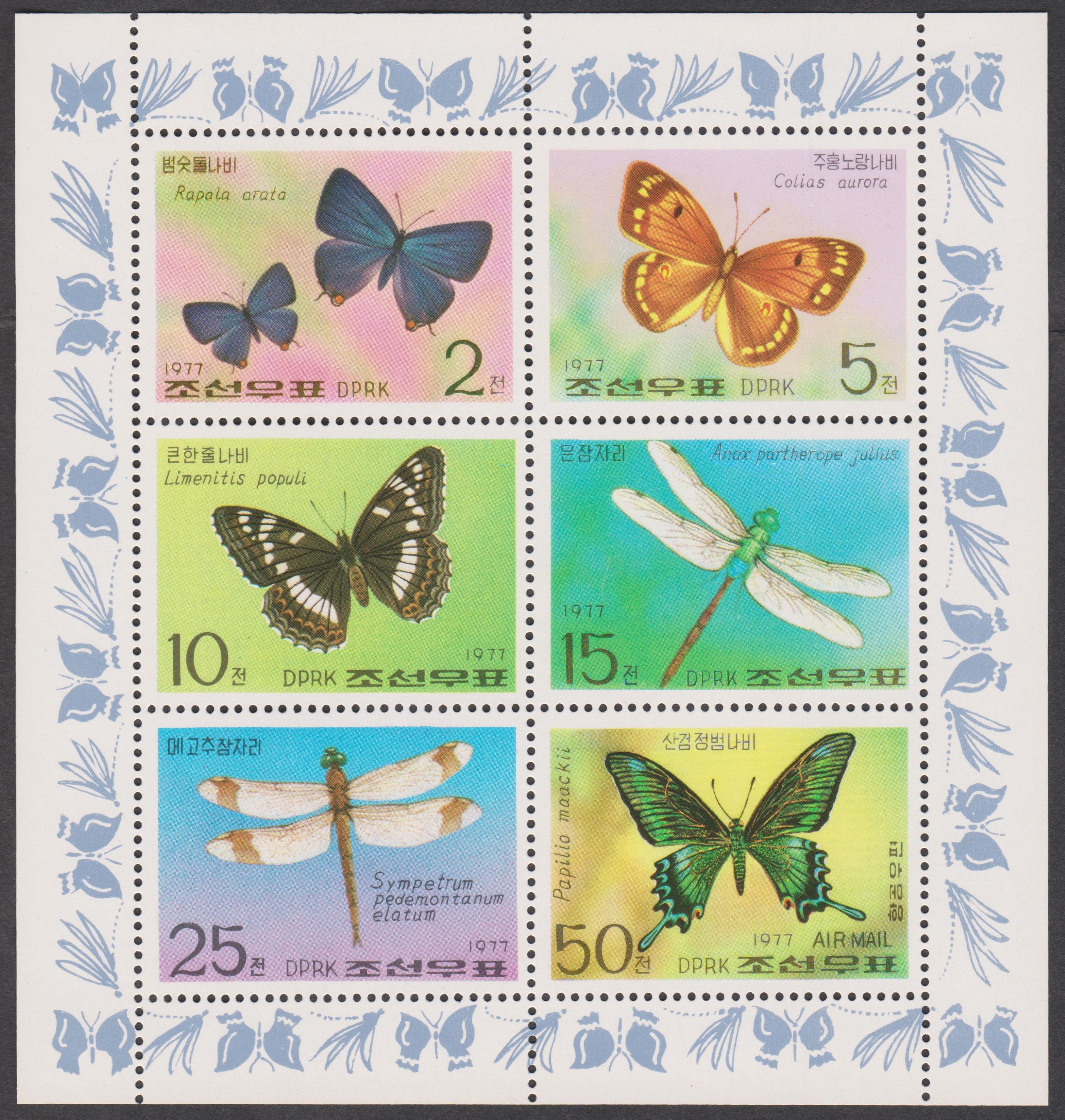 Dieser Kleinbogen Nordkorea MiNr. 1653 - 1658 zeigt Schmetterlinge und Libellen: