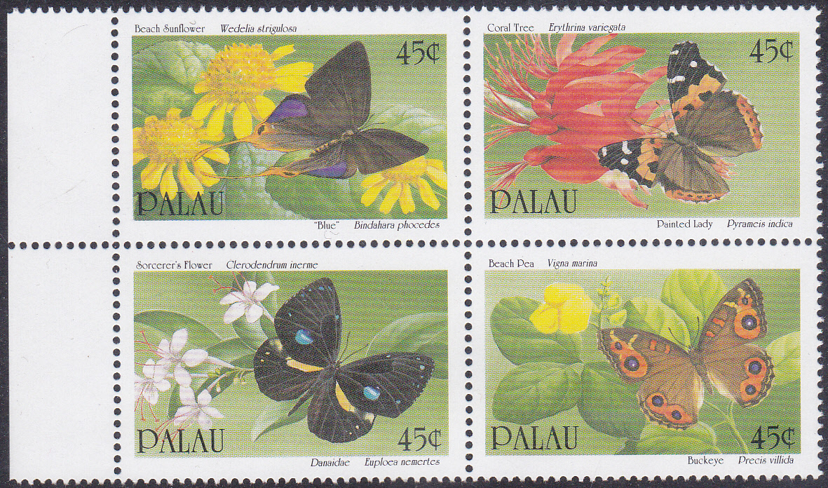 Diese Marke ist zusammen mit drei weiteren Marken mit Schmetterlingen in Viererblockanordnung zusammenhängend gedruckt worden. Hier ein kompletter Viererblock: