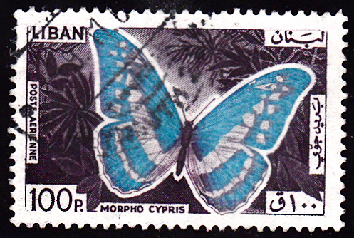 Diese Marke aus dem Libanon (MiNr 906) zeigt uns ein Männchen des Morpho cypris.