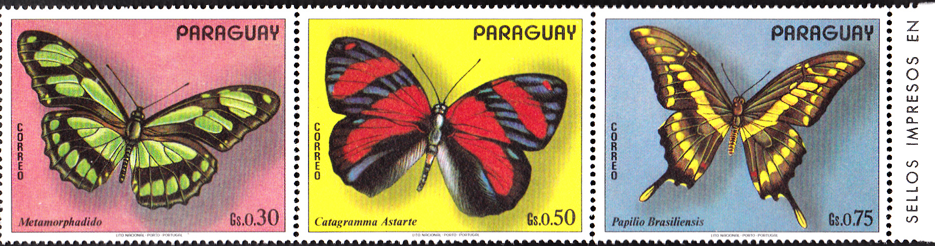 Hier eine Marke aus Paraguay (MiNr 2415) mit einem Königs-Schwalbenschwanz der Unterart Papilio thoas brasiliensis.
