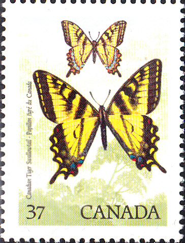 Aus Kanada kommt auch diese Marke (MiNr 1093) mit einem Kanadischen Tigerschwalbenschwanz (Papilio canadensis).