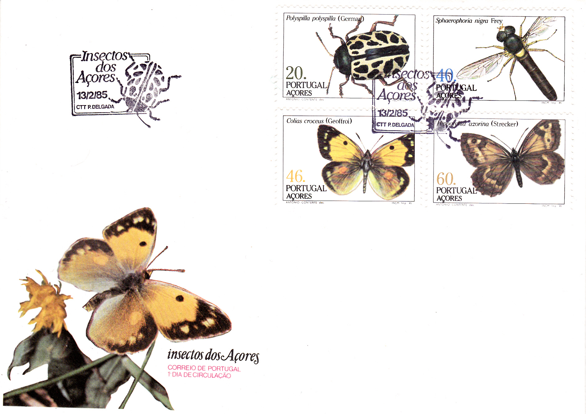 In einer Serie "Insekten der Azoren" ist auf einer Marke aus Portugal Azoren (MiNr 372 A) ein Azoren-Samtfalter (Hipparchia azorina) abgebildet.
