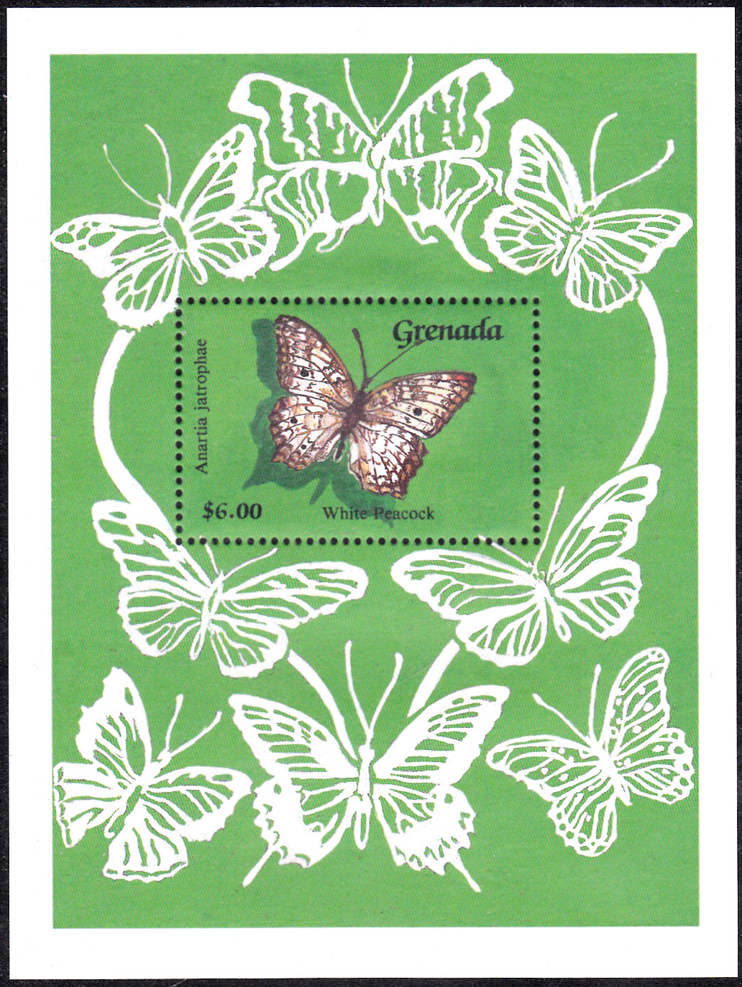 Auf der Marke aus Grenada (MiNr 2041) aus einem Block (MiNr 229) ist ein Anartia jatrophae abgebildet.