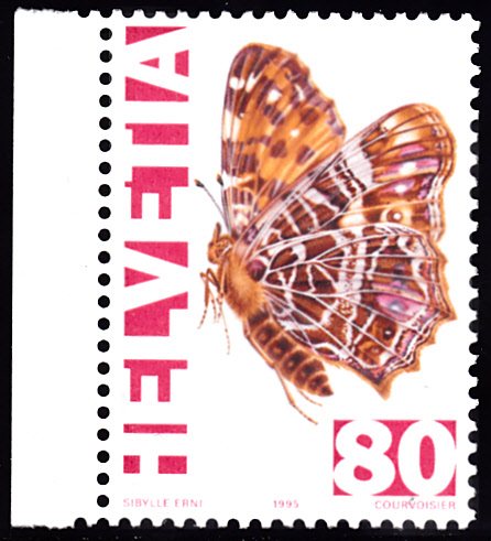 Auf dieser Marke aus der Schweiz (MiNr 1545) wird ein Landkärtchen (Araschnia levana) gezeigt.