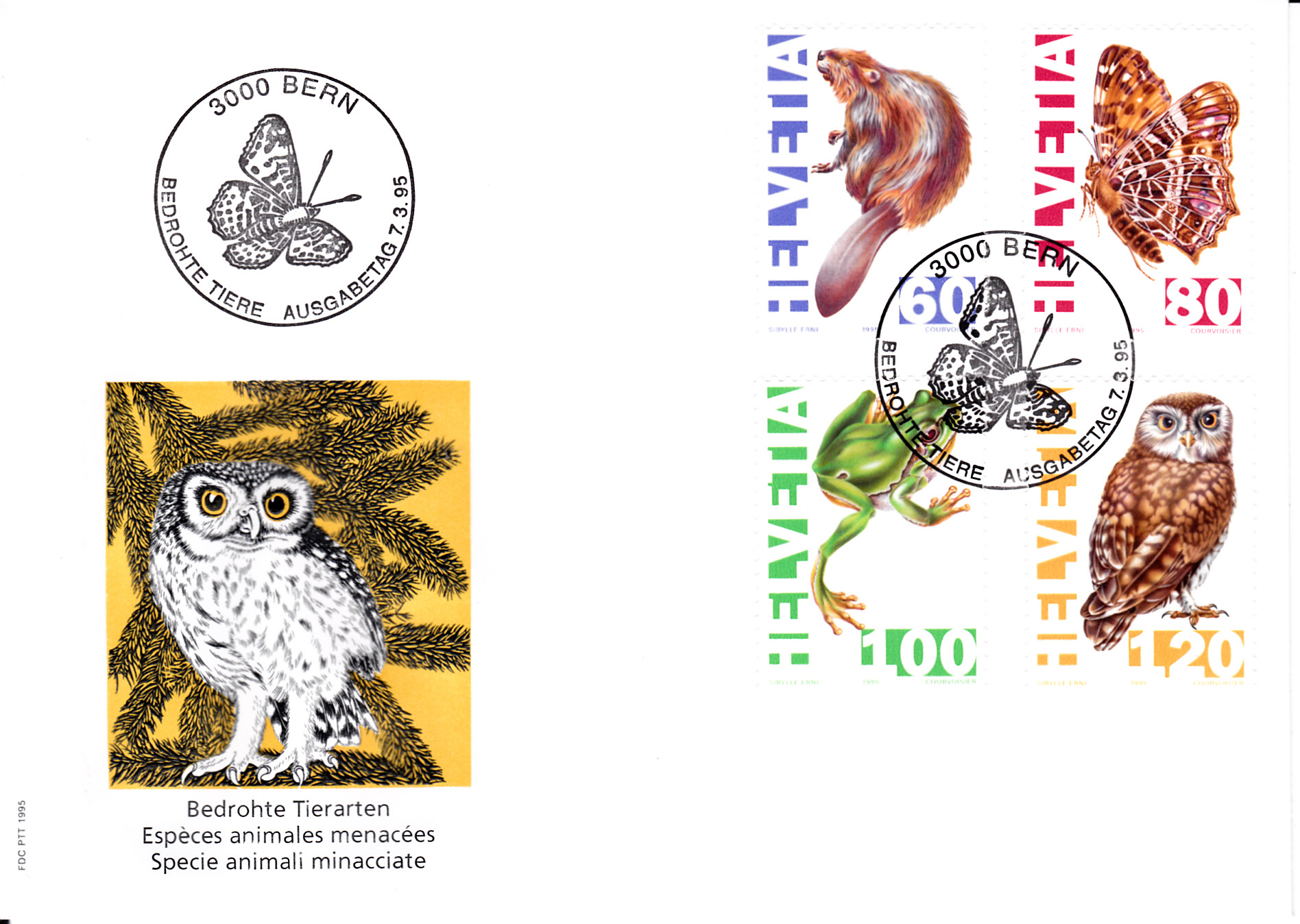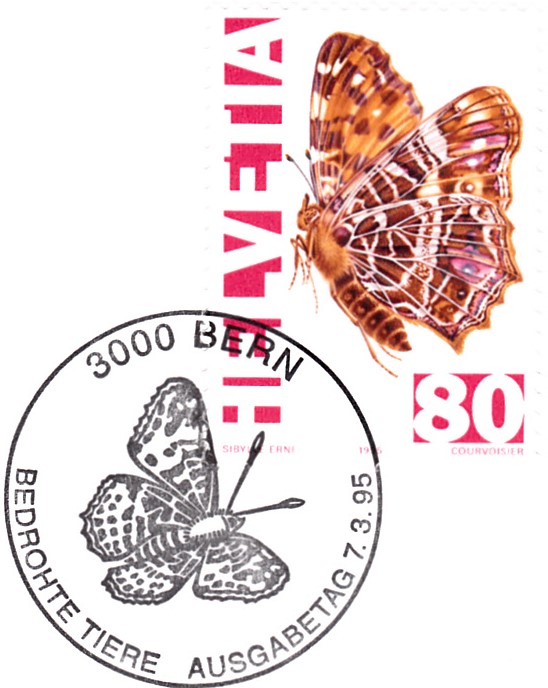 FDC der Schweizer Post mit dieser Marke. Der Ersttagsonderstempel passt exakt zum Motiv der Marke., er zeigt ebenfalls ein Landkärtchen (Araschnia levana)