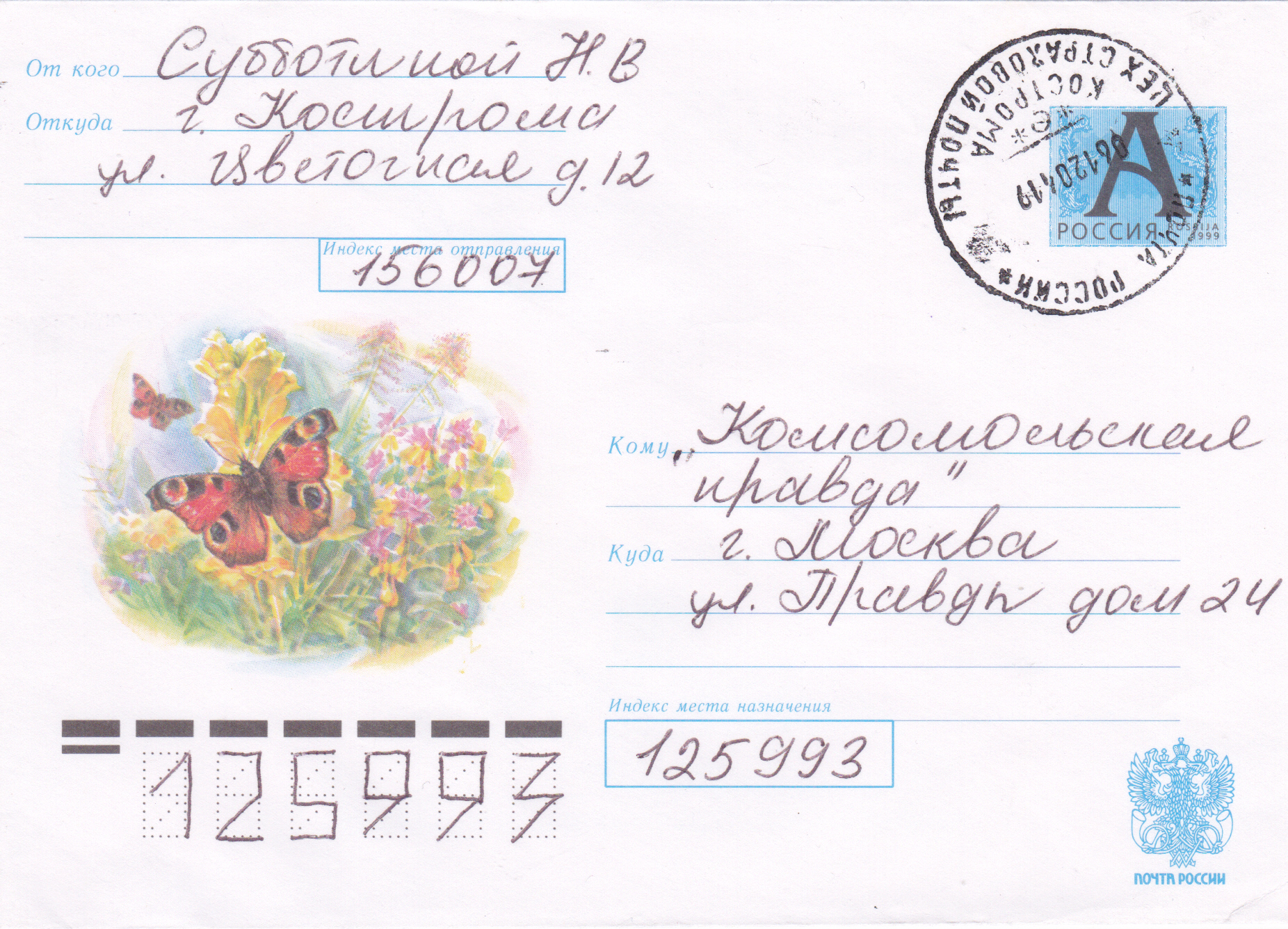 Inlandsganzsachen-Umschlag aus Russland mit dem Zudruck eines Tagpfauenauge in einer Blumenwiese.