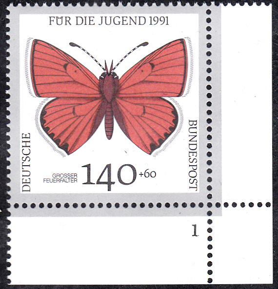Eine weitere Marke aus der Jugendmarkenserie 1991 (MiNr 1519) zeigt einen Großen Feuerfalter (Lycaena dispar). Hier eine Marke vom Eckrand mit Formnummer 1: