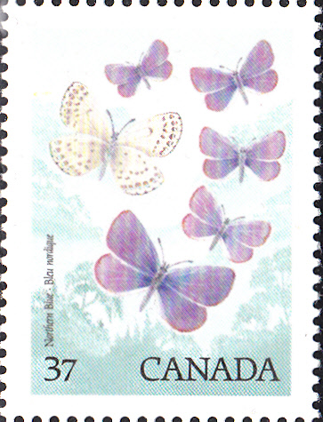 Hier eine Marke aus Kanada (MiNr 1091) mit Idas-Bläulingen. Michel nennt als Bezeichnung " Lycaeides Idas".