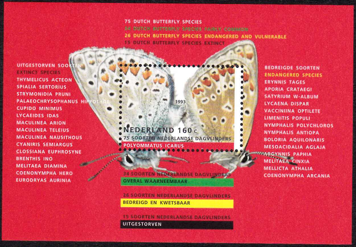 Dieser Block aus den Niederlanden (MiNr Block 38 mit Marke MiNr 1473) zeigt zwei weitere Hauhechel-Bläulinge (Polyommatus icarus).