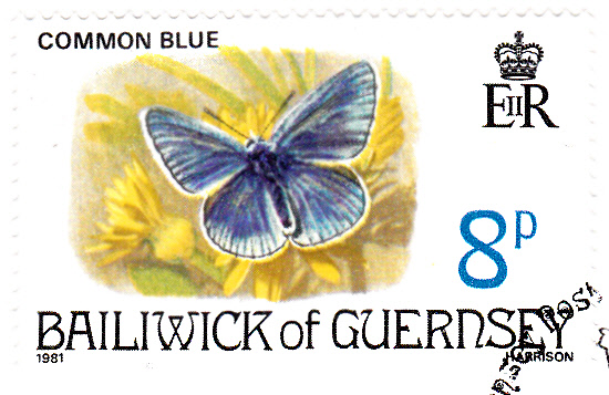 Hier eine Marke aus Großbritannien-Guernsey (MiNr 218) mit einem Hauhechel-Bläuling (Polyommatus icarus).
