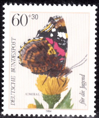 Auf der Jugendmarke zu 60+30Pf der Deutschen Bundespost (MiNr 1203) aus dem Jahre 1984 wird ein Admiral (Vanessa atalanta) gezeigt.