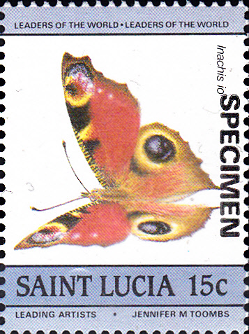 In St.Lucia ist in einer Serie auch eine Marke (MiNr 733) mit einem Tagpfauenauge (Aglais io) erschienen. Hier zeige ich eine Mustermarke dieser Ausgabe: