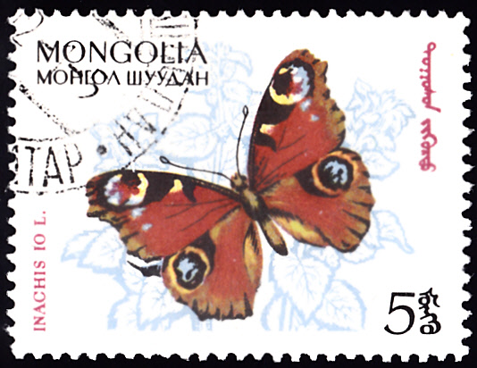 Aus der Mongolei kommt diese Marke (MiNr 336) mit einem weiteren Tagpfauenauge (Aglais io).