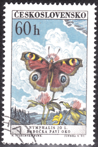 Einen weiteres Tagpfauenauge (Aglais io) zeigt diese Marke aus der Tschechoslowakei (MiNr 1305).