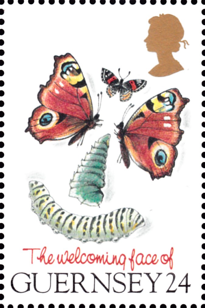 In einer Serie mit "Grußmarken: Lächelnde Gesichter aus landestypischen Produkten" ist auf Guernsey auch diese Marke (MiNr 669) erschienen, die auch zwei Tagpfauenauge (Aglais io) zeigt.