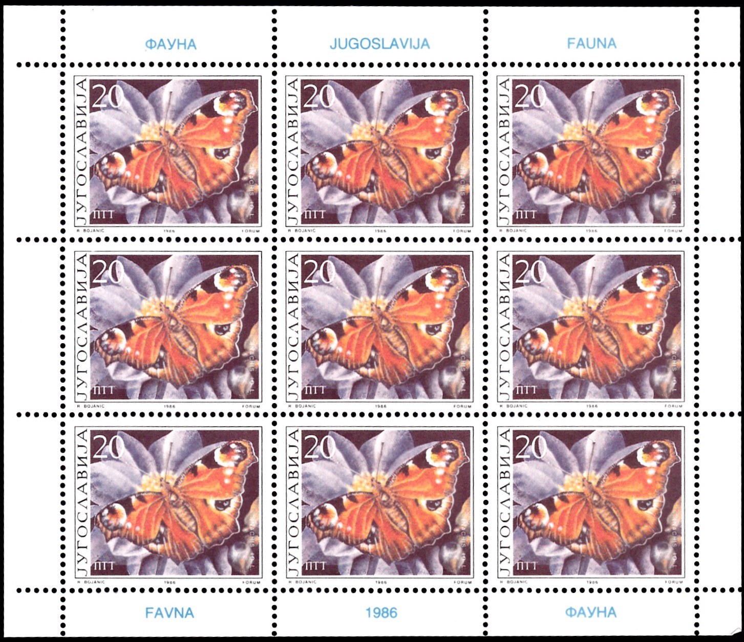 Die bereits gezeigte Marke aus Jugoslawien (MiNr 2172) mit einem Tagpfauenauge (Aglais io) ist als Kleinbogen mit 9 Marken erschienen. Heute kann ich hier auch einen kompletten Kleinbogen zeigen.