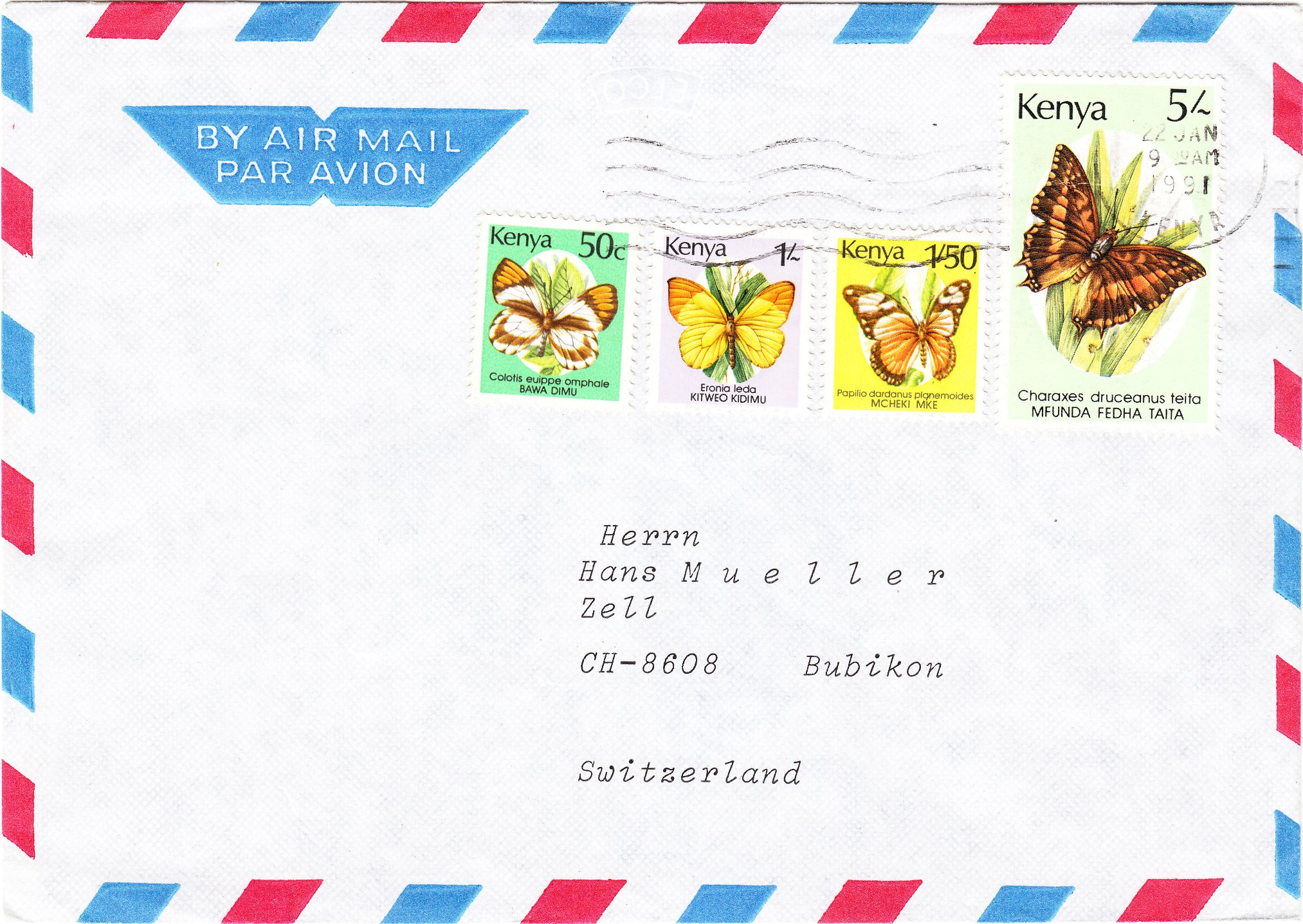 Dieser Brief aus Kenia in die Schweiz wurde gleich mit vier verschiedenen Briefmarken frankiert, die Tagfalter zeigen: