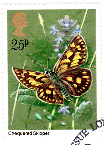 Auf dieser Marke aus Großbritannien (MiNr 878) ist ein Gelbwürfeliger Dickkopffalter (Carterocephalus palaemon) zu sehen.
