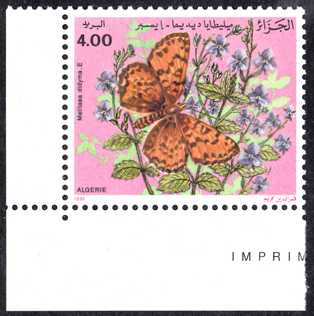 Auf dieser Marke vom Eckrand aus Algerien (MiNr 1051) ist Rotet Scheckenfalter (Melitaea didyma) zu sehen.