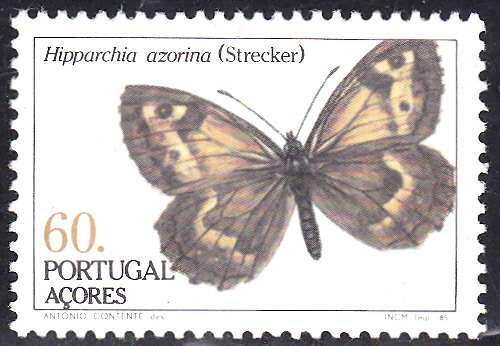 In einer Serie "Insekten der Azoren" ist auf einer Marke aus Portugal Azoren (MiNr 372 A) ein Azoren-Samtfalter (Hipparchia azorina) abgebildet.