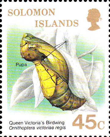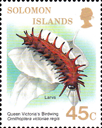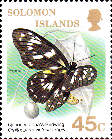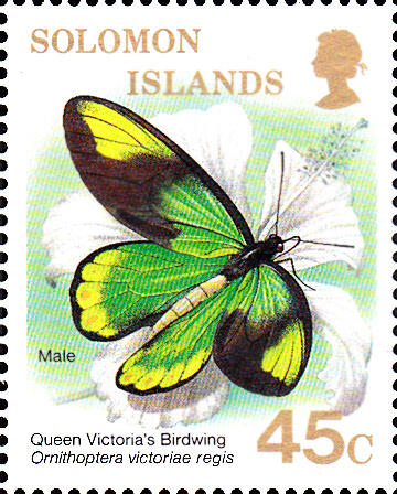 Diese Marke der Salomoninseln (MiNr 670) zeigt ein Männchen einer Unterart des Königin-Viktoria-Schmetterling (Ornithoptera victoriae regis).
