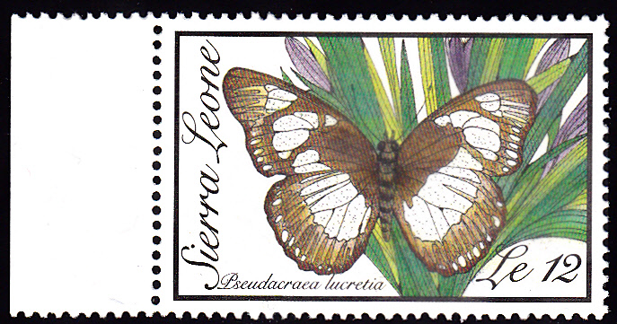 Auf dieser Marke aus Sierra Leone (MiNr 1280) wird ein Pseudacraea lucretia gezeigt.