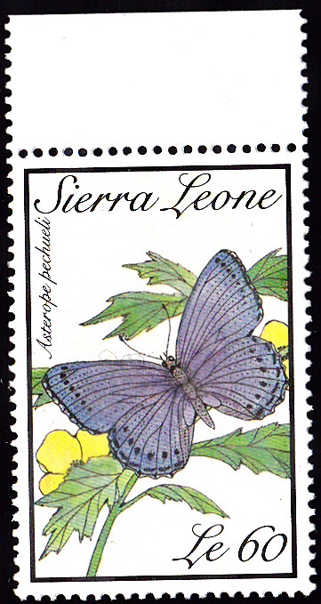 Asterope pechueli ist ein Tagfalter aus der Familie der Edelfalter (Nymphalidae). Hier eine Marke aus Sierra Leone (MiNr 1284) mit einem Asterope pechueli.