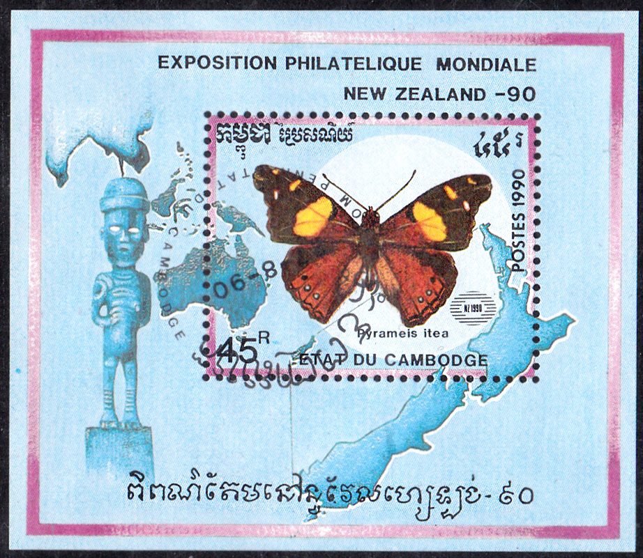 Die Marke (MiNr 1149) in diesem Block (MiNr Block 176) aus Kambodscha zur Internationalen Briefmarkenausstellung NEW ZEALAND ’90 zeigt einen Vanessa itea.