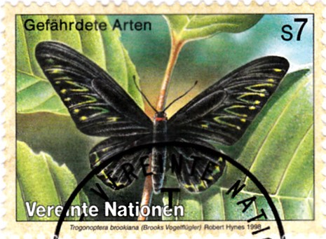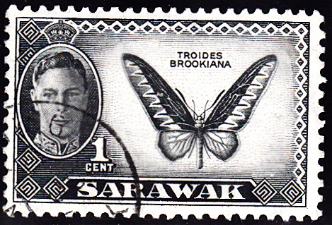 Diese Marke (MiNr 171) aus Sarawak, einem der Malaiischen Staaten, wird ein Trogonoptera brookiana gezeigt.