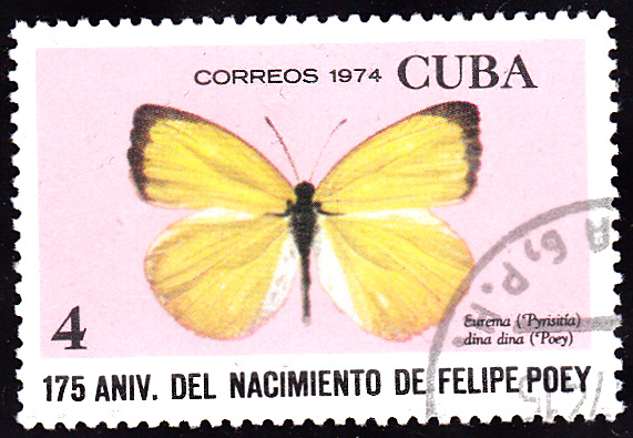 Diese Marke aus Kuba (MiNr 1971) zeigt die Unterart Eurema dina dina, die auf Kuba vorkommt.