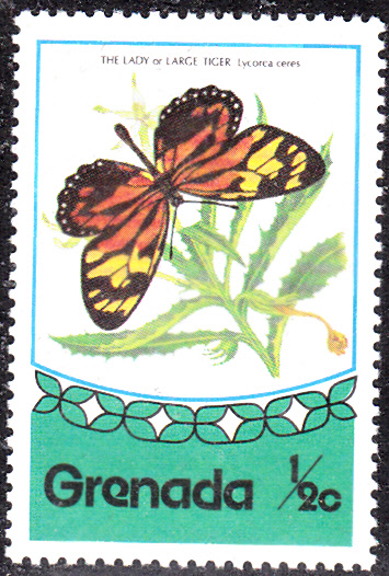 Hier eine Marke aus Grenada (MiNr 693) mit der Unterart Lycorea halia halia (Syn.: Papilio ceres, Lycorea ceres).
