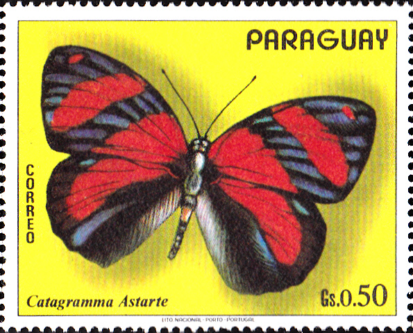 Diese Marke aus der gleichen Serie aus Paraguay (MiNr 2414) zeigt uns einen Catagramma astarte. Heute wird er Callicore astarte (engl.: the Astarte eighty-eight) genannt. Es gibt 12 Unterarten und noch mehr Synonyme. Er kommt von Mexiko bis nach Brasilien vor.