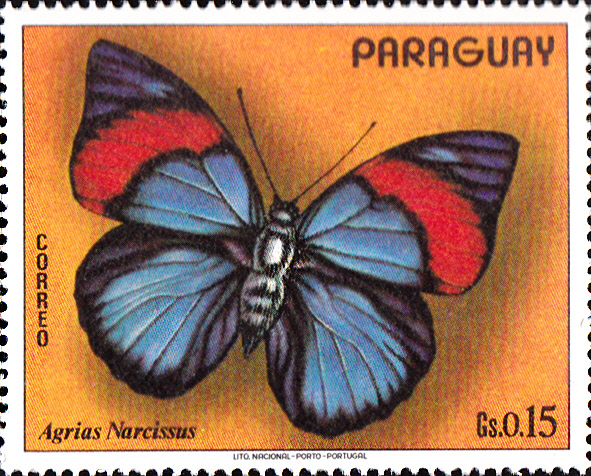 Agrias narcissus ist ein Tagfalter aus der Familie der Edelfalter (Nymphalidae). Es gibt drei Unterarten. Er kommt in Südamerkia vor. Diese Marke aus Paraguay (MiNr 2410) zeigt einen Agrias narcissus.